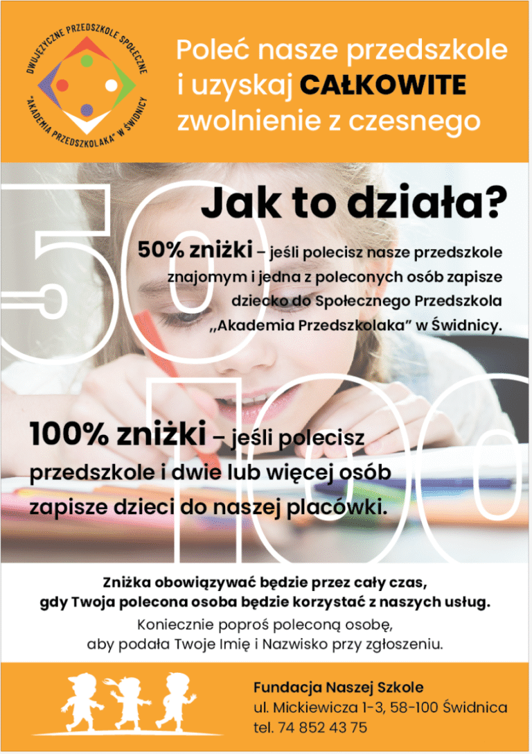 Poleć nasze przedszkole i uzyskaj CAŁKOWITE zwolnienie z czesnego.